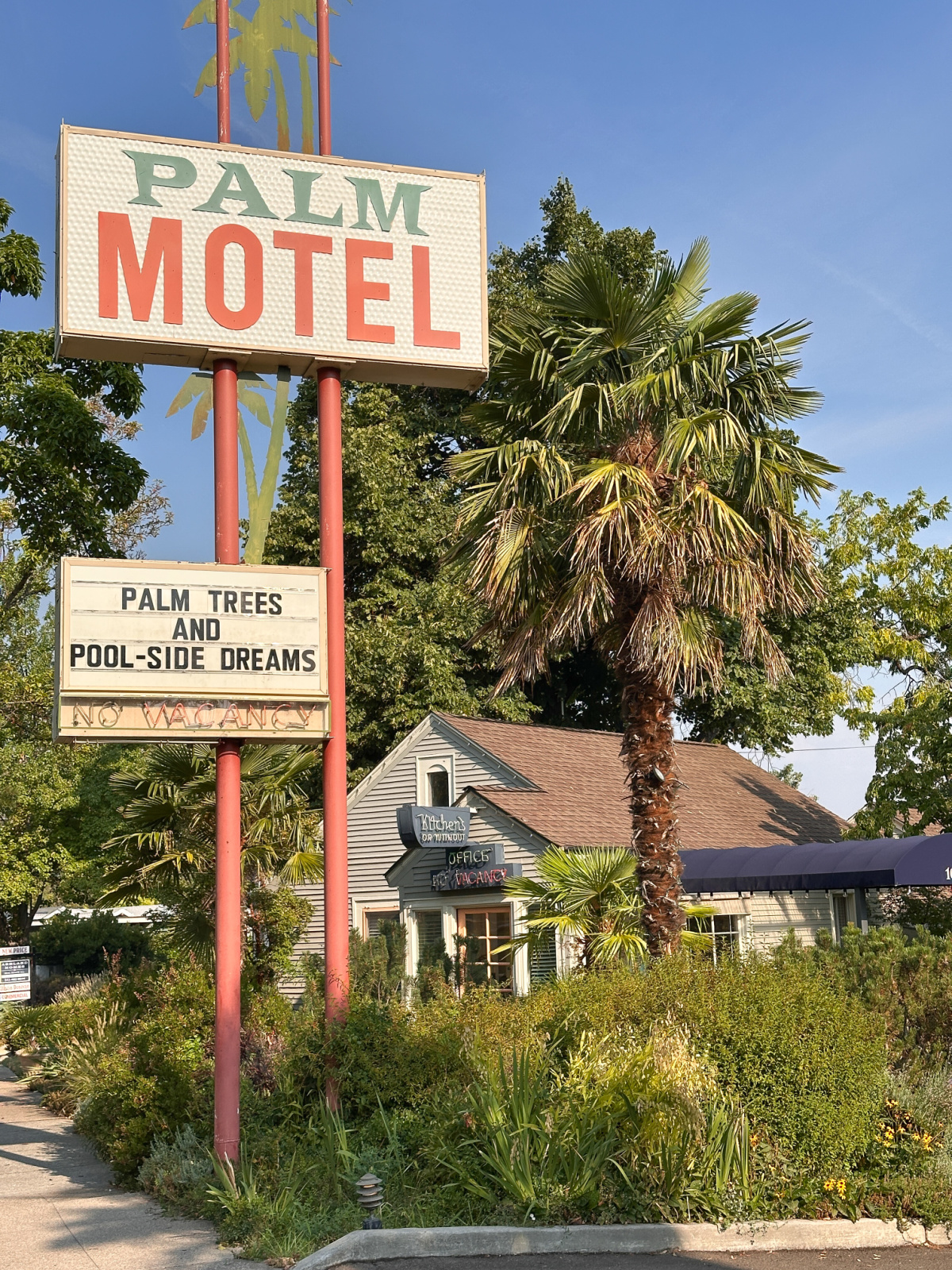 In addition to the Lithia Springs Resort, which is about 5 minutes outside of downtown, and there are many other accommodation options in the downtown area including the historic Ashland Springs Hotel. The 1925 landmark hotel is in then center of town and worth a look whether or not you’re staying there. You can’t miss the Stratford Inn and Bard Inn on the main drag, Siskiyou Boulevard. And we also noticed the Palm Motel, a darling little place across from Southern Oregon University and just over a mile from the center of town. Next to the Palm is the Morning Glory Cafe that serves breakfast and brunch and looked adorable and popular with a line spilling onto the sidewalk. We met a very friendly kitty on the motel’s sidewalk.
