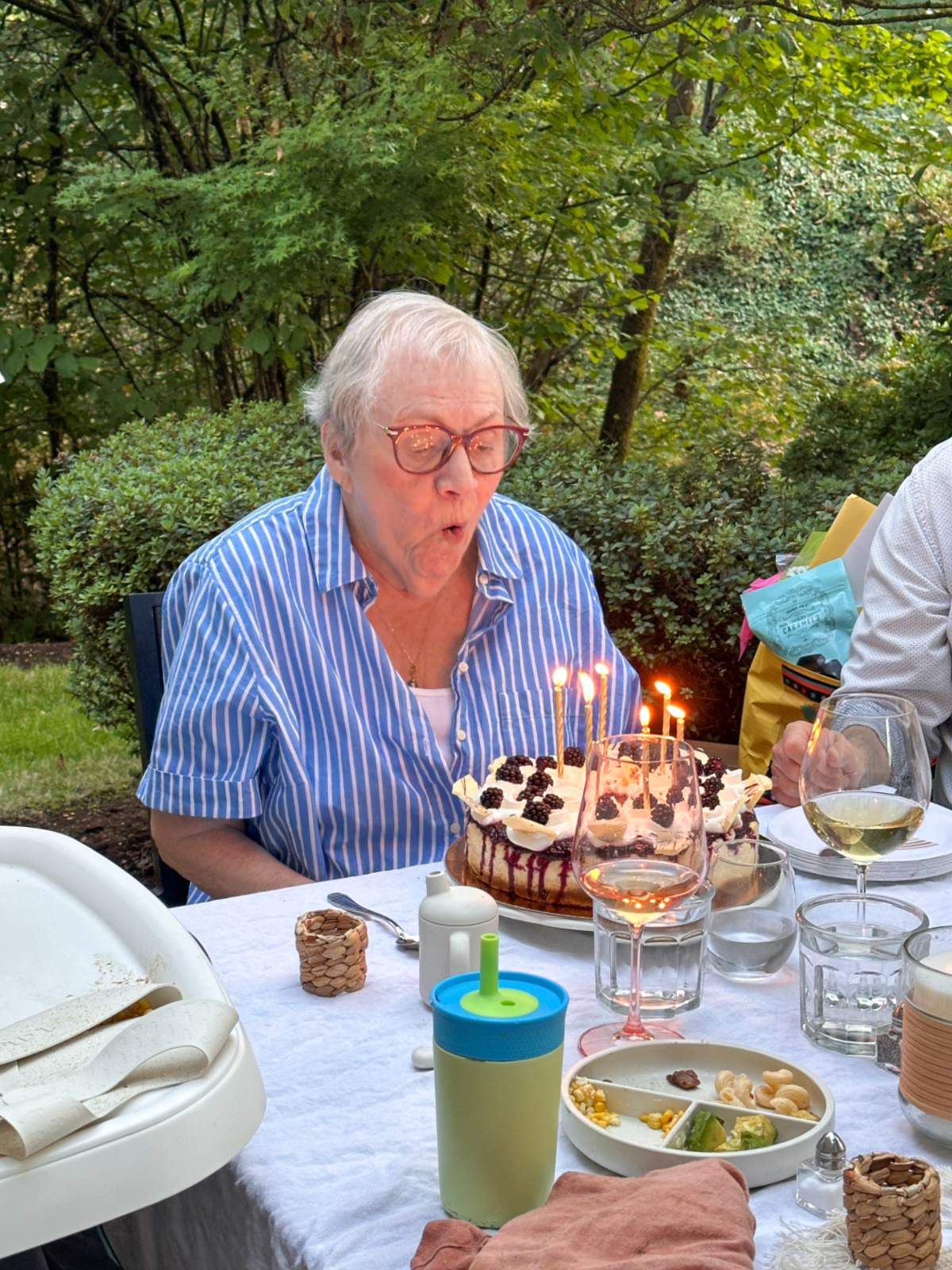 John and Julie’s backyard is just lovely with a beautiful deck overlooking a lush lawn bordered by mature trees and shrubs … it’s enchanting. Dinner was delicious, and Ruth blew out her birthday candles on an enormously decadent – and scrumptious – cheesecake. It was so fun to be with everyone and I wish we lived closer so we could do it more often.