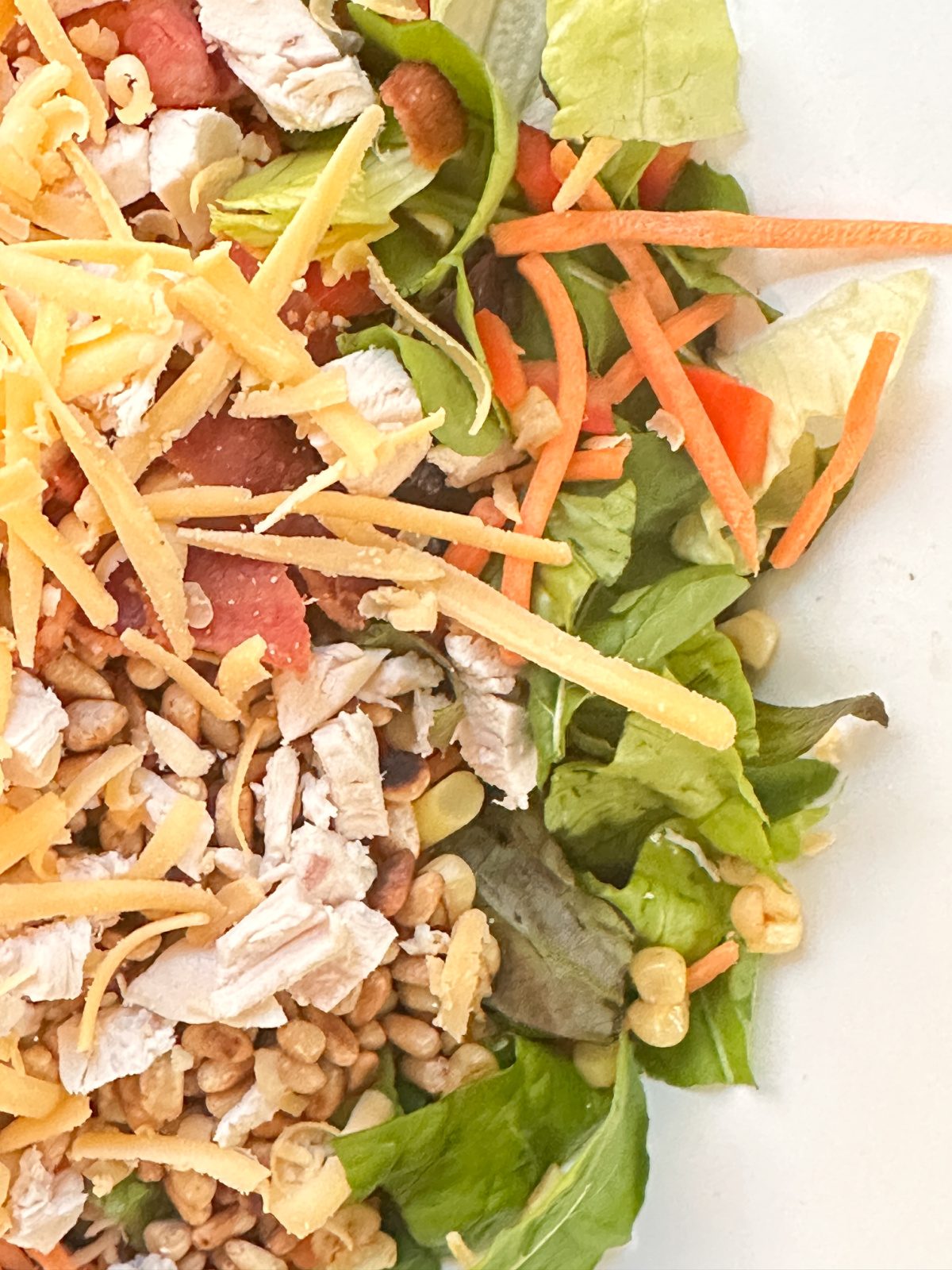 Did I mention it’s been hot? And who wants to cook in the heat? Ugh, not me. Fortunately, we have more lettuce than we know what to do with thanks to our raised bed garden. So it’s been a lot of no-cook salads for us. Last week I made one using up everything but the kitchen sink. I even roasted an ear of corn and tossed it in. Jim says I add corn to everything. That’s not true, but if I can I do.