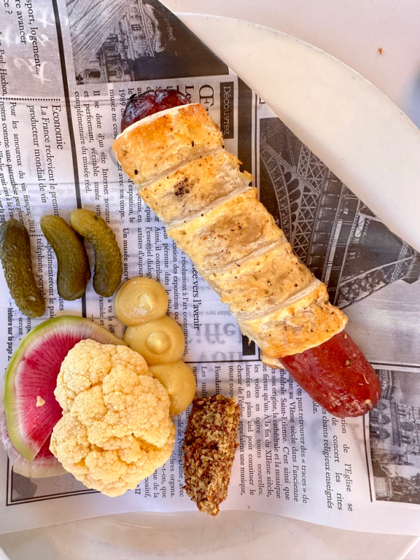 It was hard to decide between French onion or potato leek soup, but I settled on the latter as my starter. I talked Jim into the Cochon in a Blanket, which turned out to be our favorite thing.