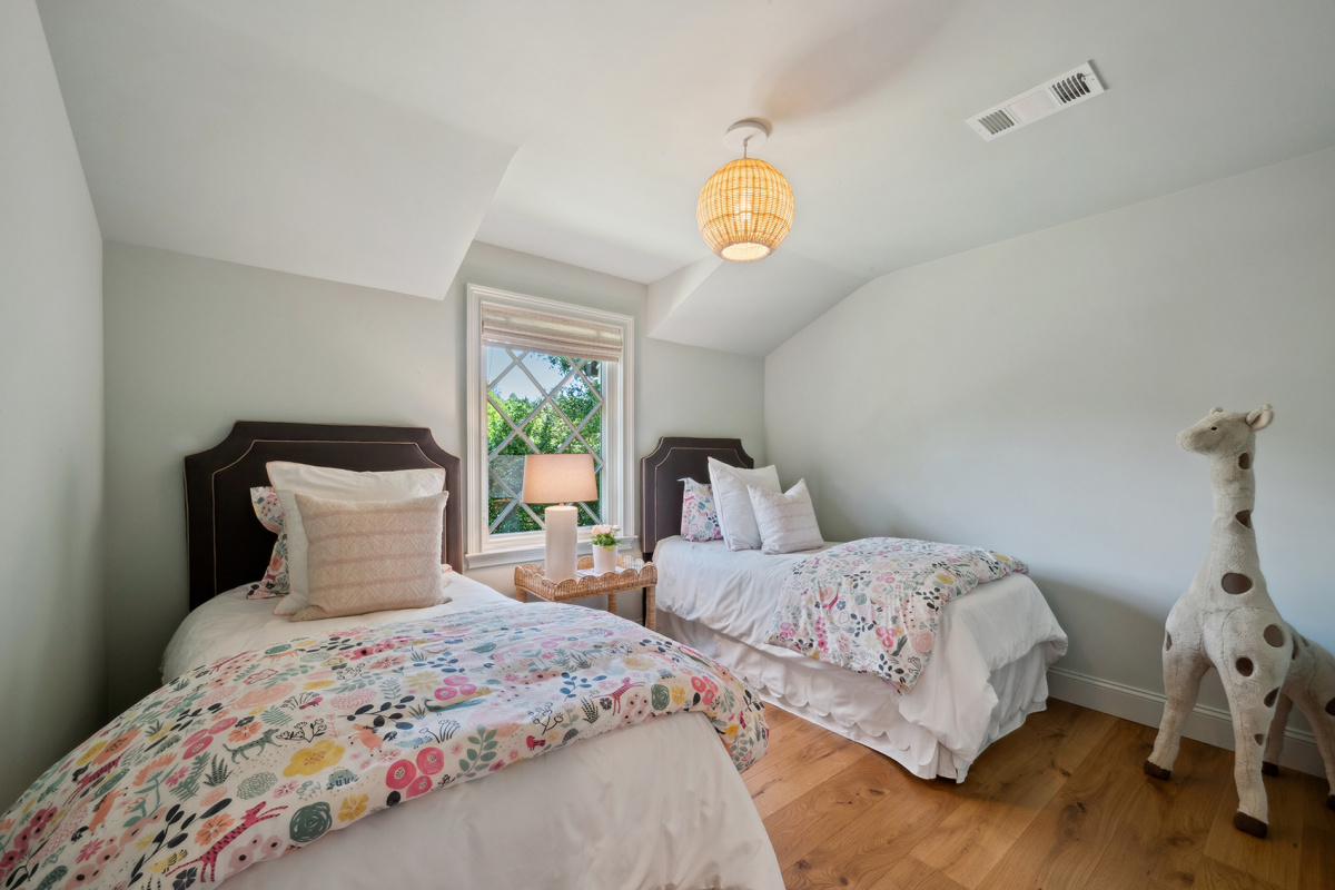 Isn’t it sweet?! It’s exactly what I imagined for the space. Emily of the Dana Green Team oversaw the transformation and I adore her choice of Serena & Lily’s scalloped rattan side table between the beds and the cute new Pottery Barn Sarah’s Garden comforter and shams. What a charming bedroom for littles or teens. I can picture future slumber parties with lots of whispering back and forth during the wee hours.