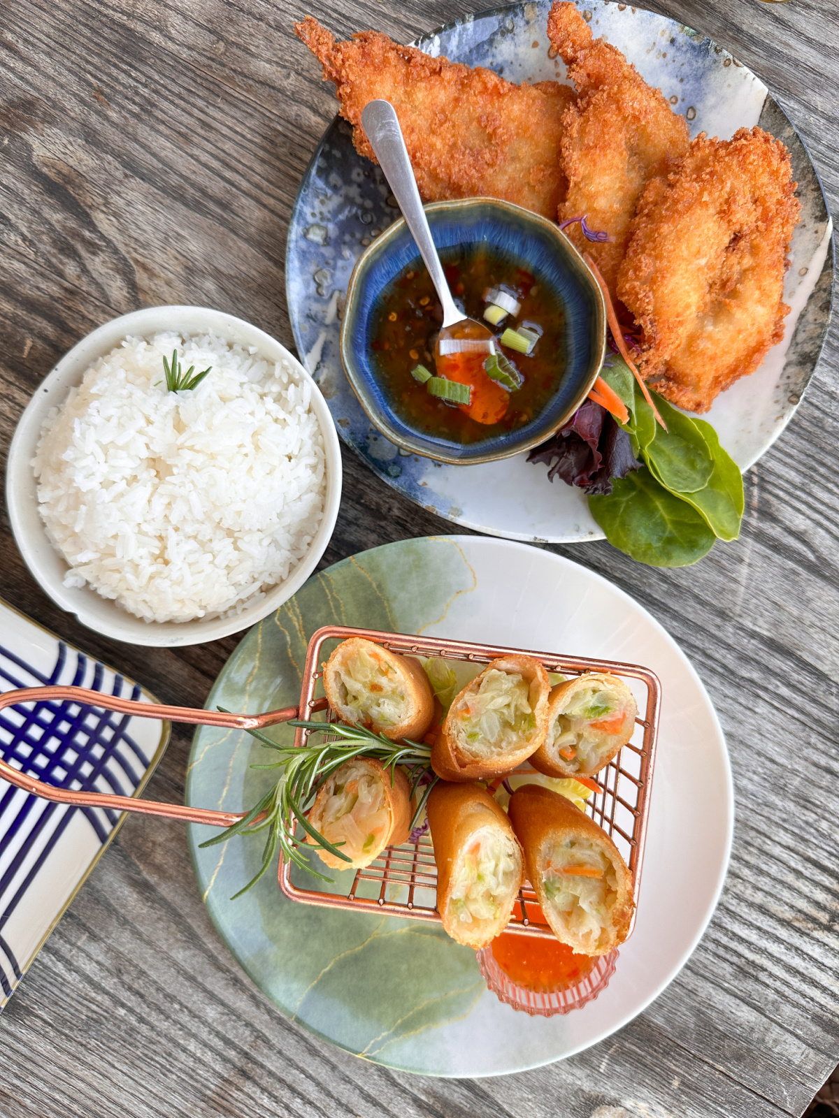 On Monday, our 22nd wedding anniversary, we walked to town and availed ourselves of the happy hour small plates and cocktails at a newish restaurant, Skylar Bistro. The food is phenomenal – as is the charming outdoor seating area next to the park.