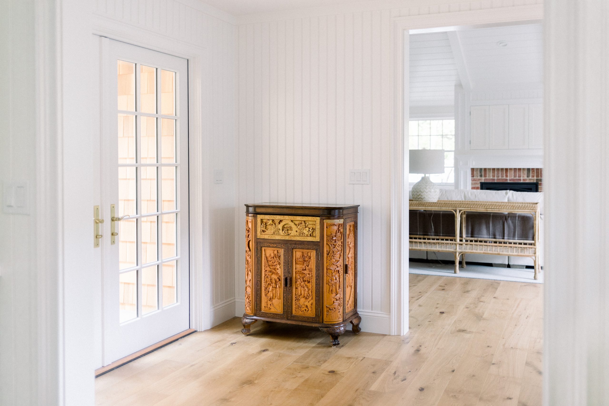 The lower walls in the foyer and hallway received a beautiful wainscot treatment. The upper walls – between the wainscot and crown – are drywalled in a smooth finish. These spaces don’t have great natural light and the hallway is narrow. I wanted them to feel light and airy and create the illusion of spaciousness. Jet suggested Slipper Satin for the upper walls and Wimborne White for the wainscot and trim. Wimborne White was also designated for the moldings and trim throughout the house.