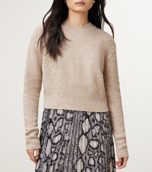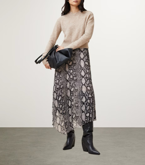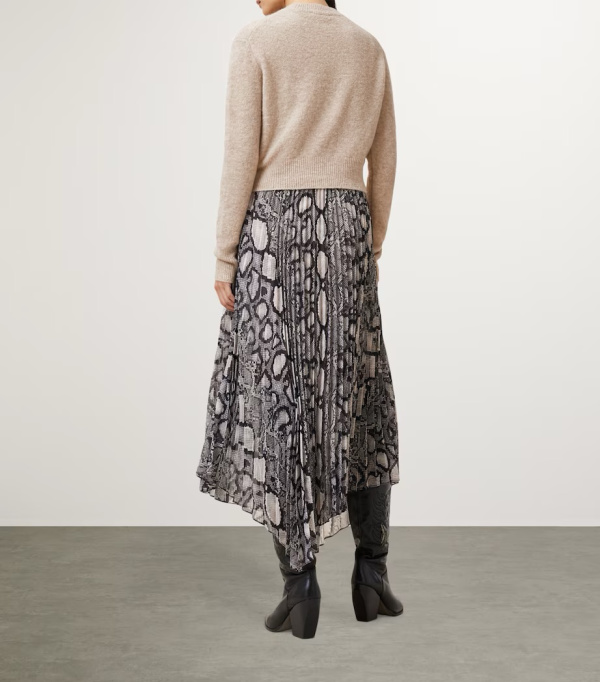 I haven’t been able to get it out of my mind so I hunted it down. It’s light weight and floaty and I love the snake skin print and pleated, handkerchief hem. The sweater is not attached, so the camisole top dress can be worn on its own. And so can the sweater.