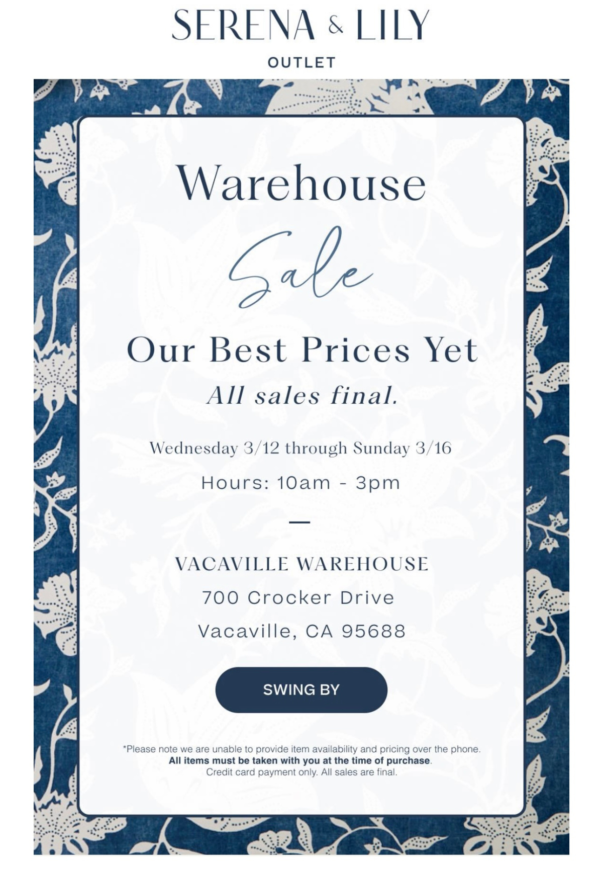 But there’s good news, they’re hosting a warehouse sale this weekend. It started Wednesday and runs through tomorrow. I’m sure there’s a ton of good stuff to be had at great prices.