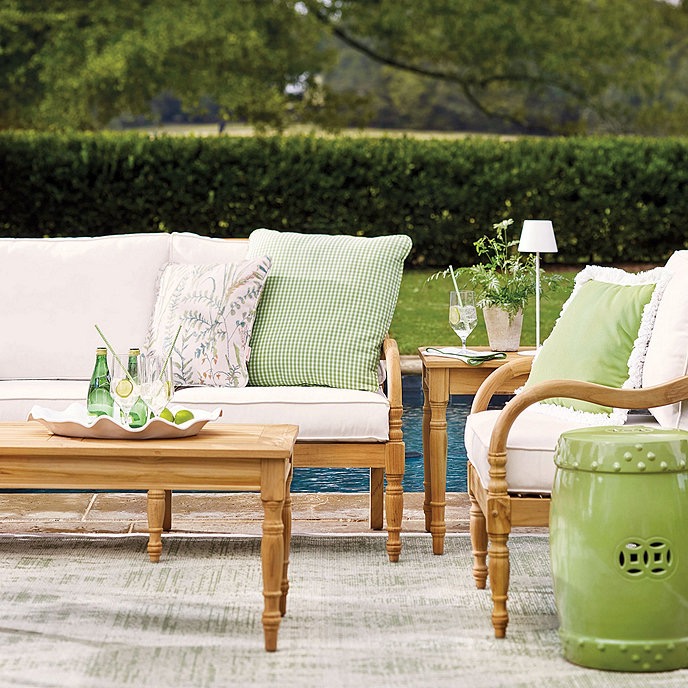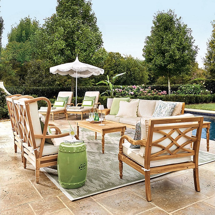 Ballard Designs has a collection of pretty greens they call Kiwi. Insert me into this poolside scene featuring Ballard’s Ceylon teak collection.