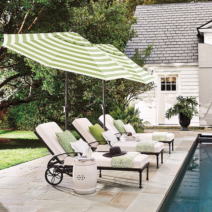 Don’t you love these striped umbrellas shading the chaise lounges? We have a set of these Amalfi chaises, and I log a considerable amount time there during the summer. We also have three of the classic garden stools in white (it’s not a white white). One can never have too many garden stools and I’m tempted to add the Kiwi green.