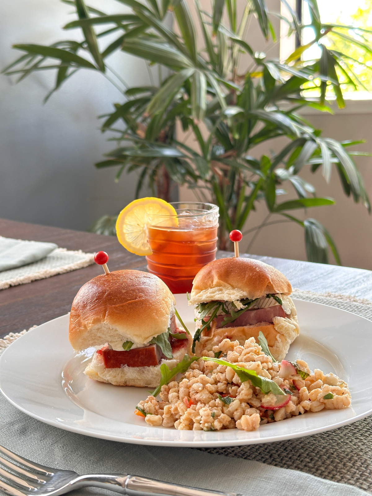 When we were done at the park we walked across the parking lot to William Land Regional Park for a picnic. I brought Sophie’s favorite farro salad with radishes, arugula and feta, and ham and brie sandwiches. Both recipes – from Nancy Fuller – have been a summer staple in our house for years.