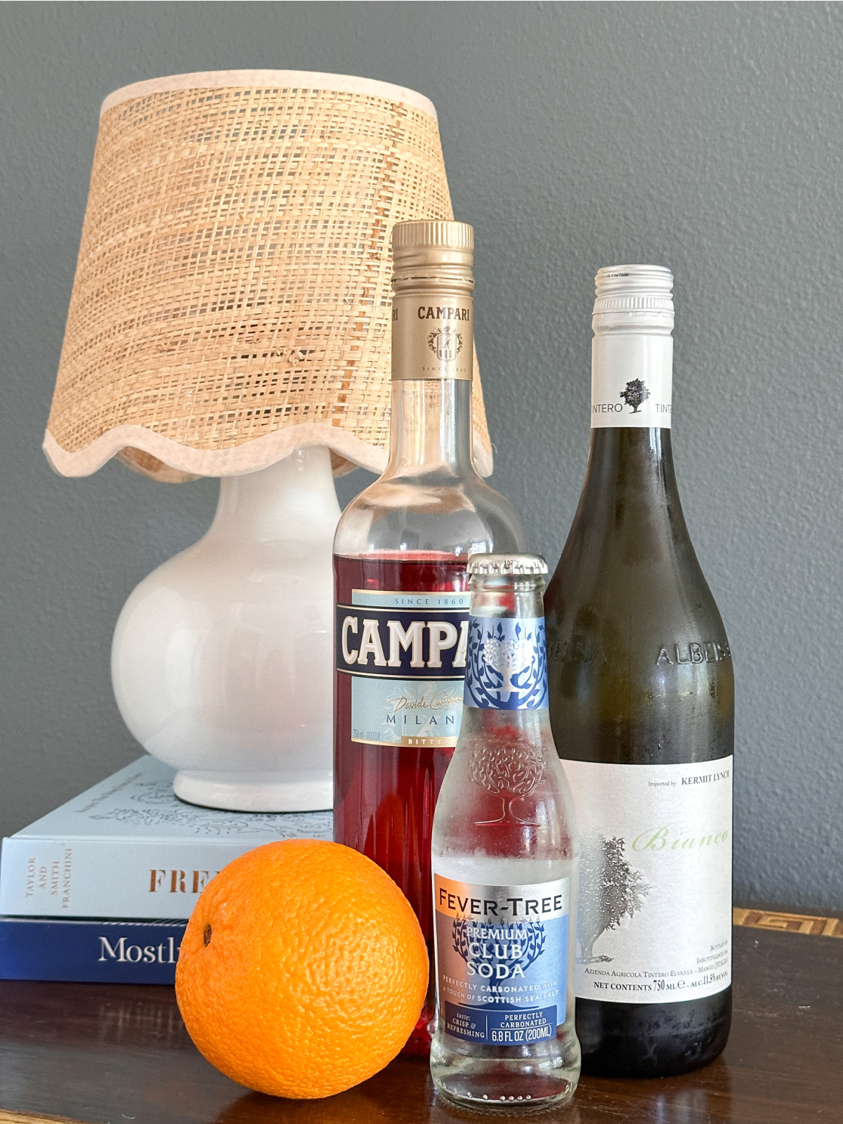 Dry white wine, like a Sauvignon Blanc or Pinot Gris, Campari, Club Soda, and an orange. Recipe here.