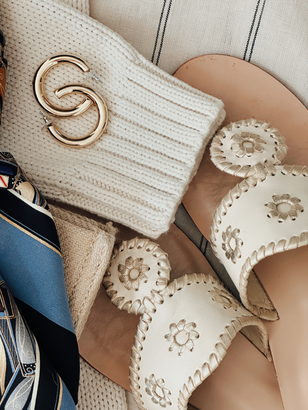I like the striped pants on you and the fact that the stripes are vertical. That’s still not easy to find from designers. I’m also loving the scarf in the one photo (navy/black/camel print). It’s beautiful, especially with the ivory sweater and gold accessories.