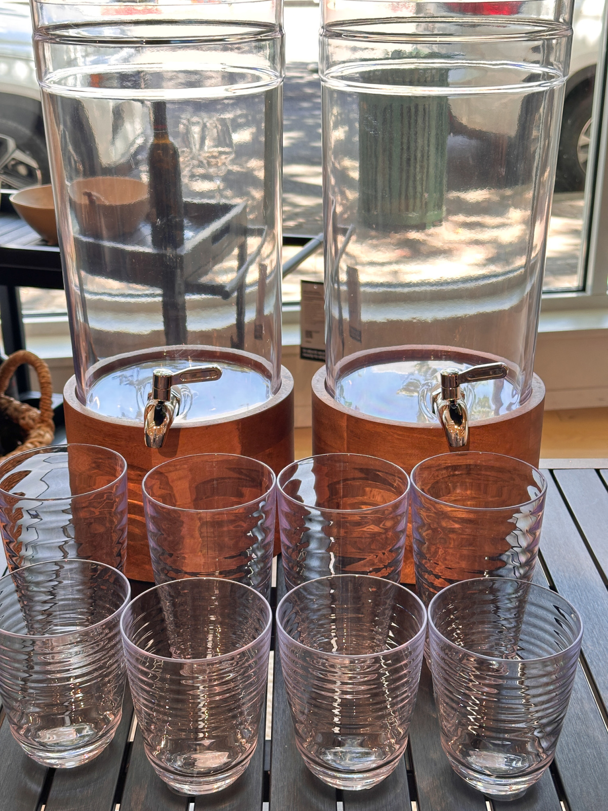 These Moroccan pitchers for great for water, I use one at each end of the table. And I love Riedel O stemless wine glasses for outside.
