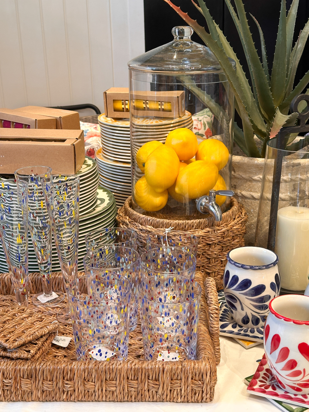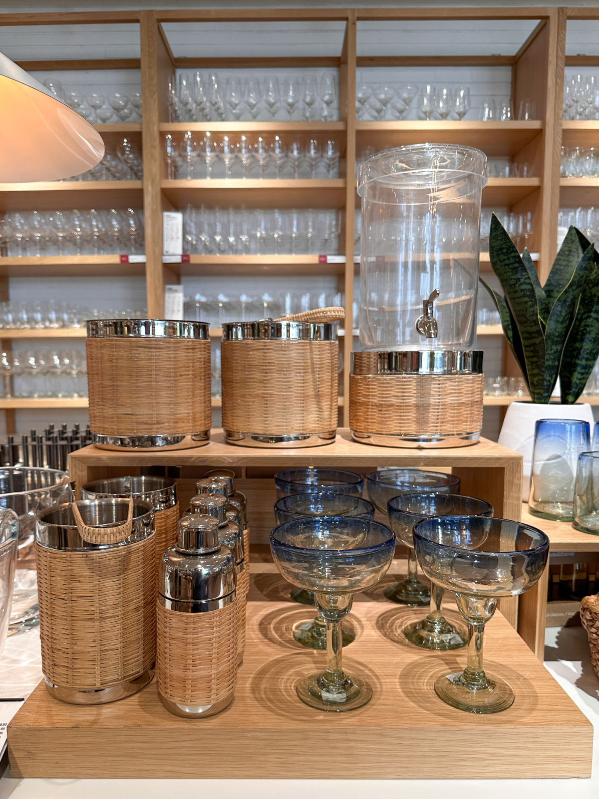 And these woven bases. The Capitola base at Pottery Barn and the stainless and wicker Amici stand at Crate and Barrel. The Amici ice bucket, wine chiller, and cocktail shaker have me swooning too.