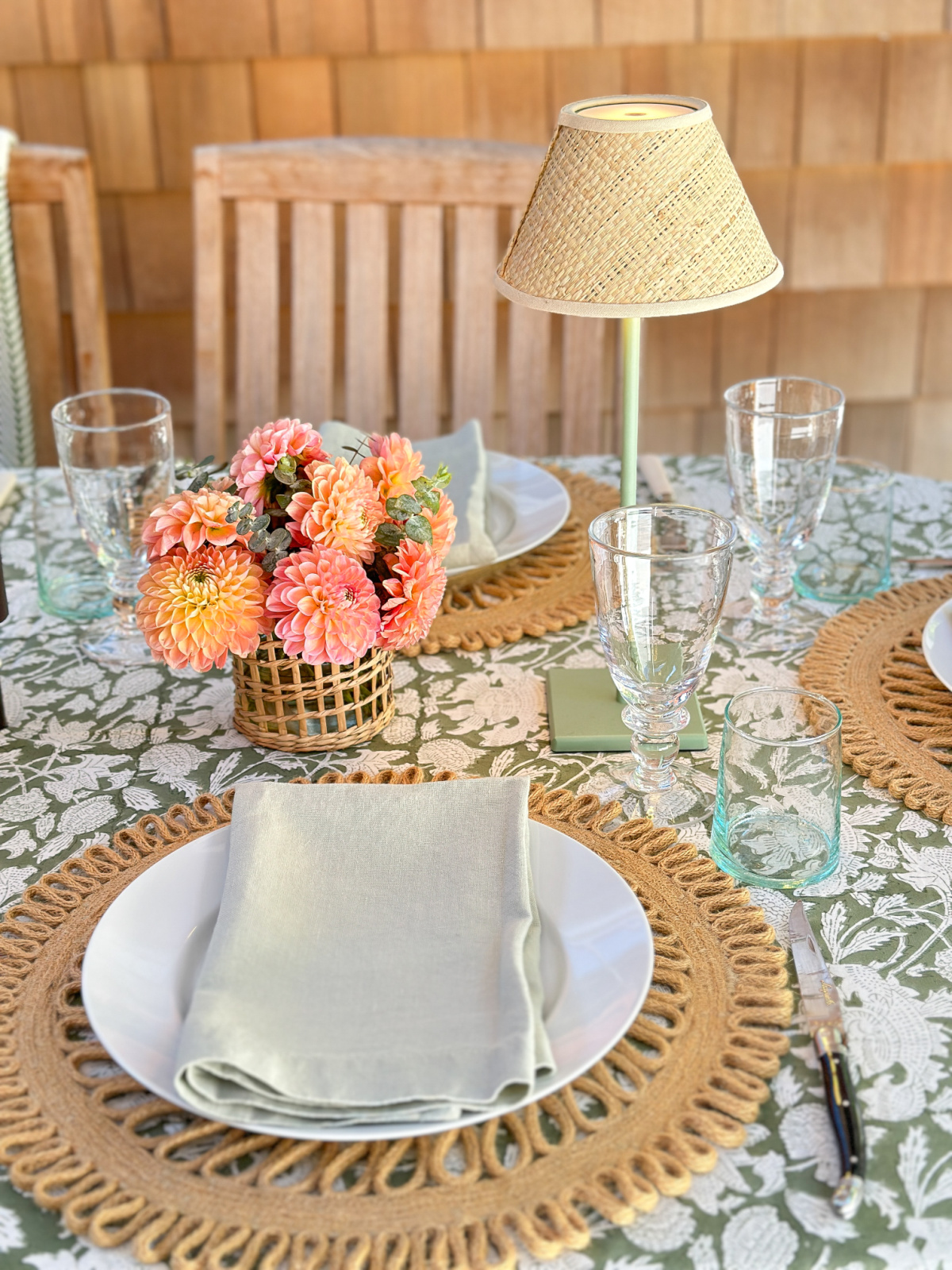 Outdoor summer table setting in green and white with peach flowers.