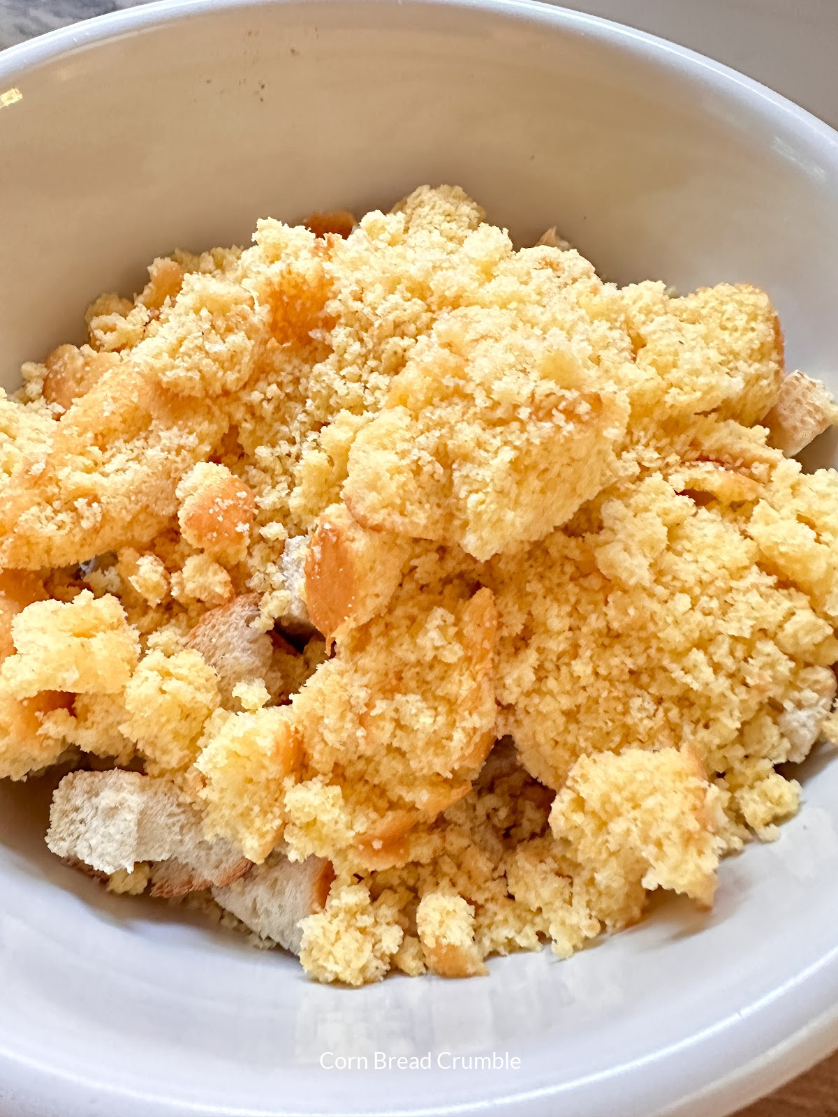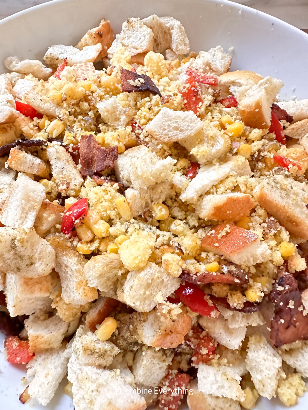 - In large bowl, add bread cubes, crumbled corn bread, bacon pieces, poultry seasoning salt and pepper and toss gently.