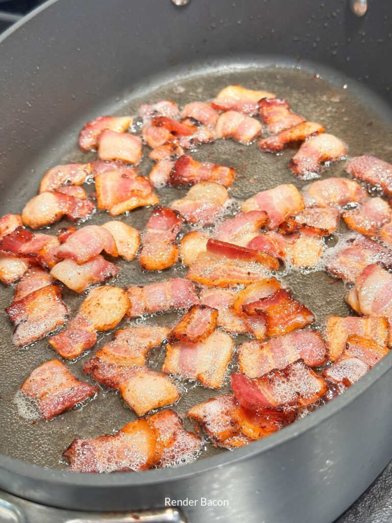 - Cook bacon pieces in large skillet until crisp. Remove bacon pieces to paper towels to drain.