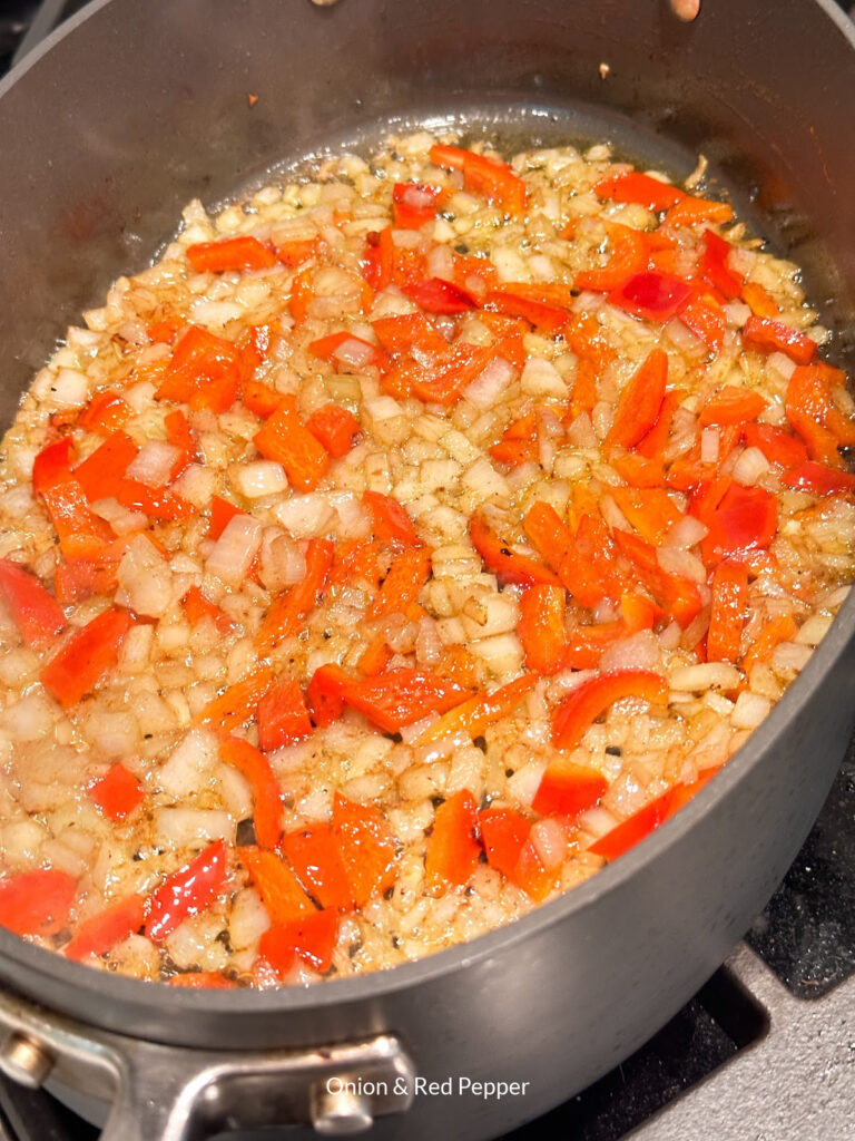 - Add onion and red pepper to bacon drippings and, stirring occasionally, for about 10 minutes.