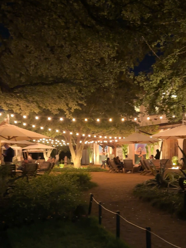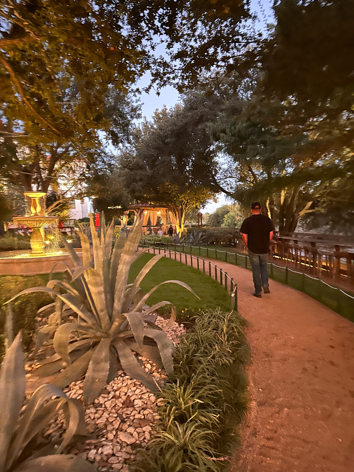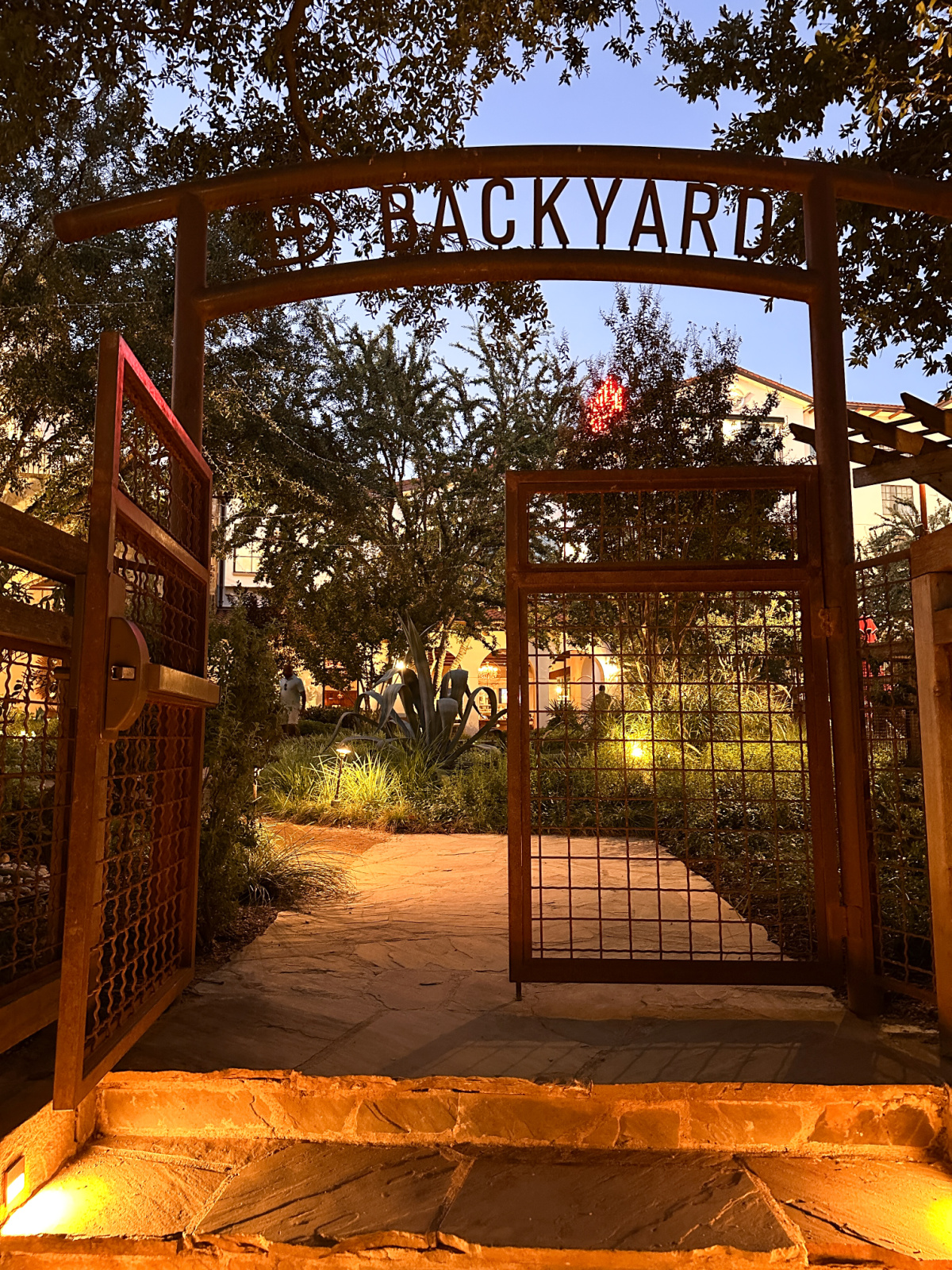 Before and after dinner we walked around what the hotel calls its backyard which includes the Veranda bar, many seating areas, a pool and spa, large lawn, and fire pits along with outdoor games. In the center of the backyard is a beautiful fountain and in the background you can see barstools lined up along a curved bar overlooking Marine Creek. After dark, when the overhead twinkle lights and fire pits came on, it was magic.