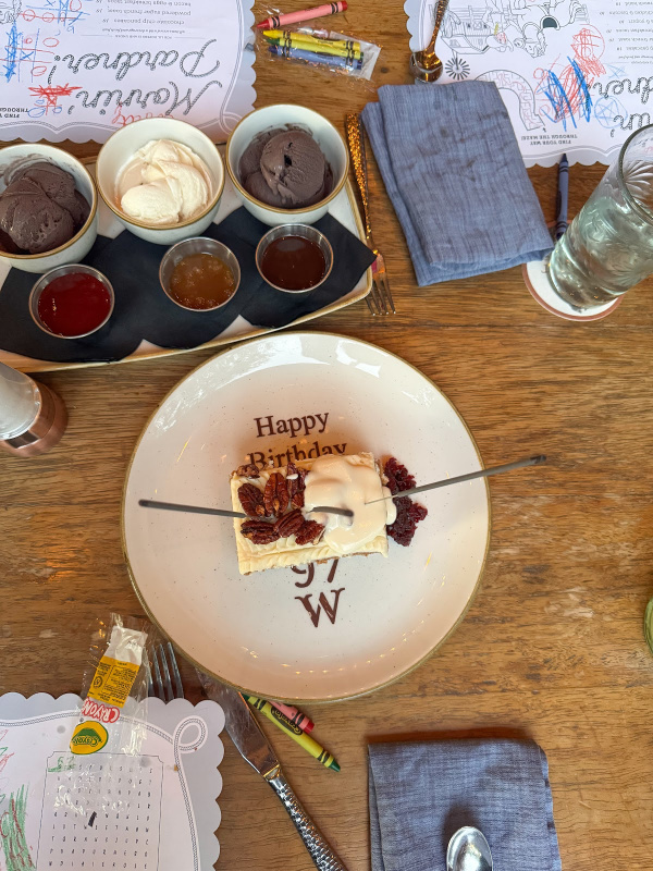 Back we went to the hotel’s 97 West Kitchen & Bar for dinner on the patio overlooking the hotel’s backyard which is a gorgeous and expansive gathering space. More on that later. We planned to celebrate all of our OND (October, November, December) birthdays. but since that included five out of eight of us we decided to celebrate everyone’s birthday so no one was left out.