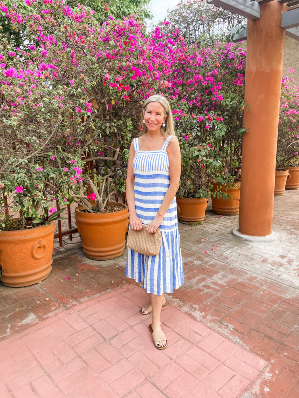 For evening I wore my new J.Crew tiered cotton mini- dress and my WARM striped midi-dress. I didn’t wear the slip dress I packed. Instead I wore this pair of white shorts with a stripped blouse from Loft. The resort vibe was very casual. I wore the same earrings every night, the smaller version of these white raffia lantern earrings. And carried this woven clutch. I can’t say enough about how much I love this clutch. It’s an ideal size to hold the stuff you need but still small and easy to carry. It comes in many fun colors and I plan to buy one in another color for our Italy trip … when I decide on a dress for the main event, our friend’s wedding.