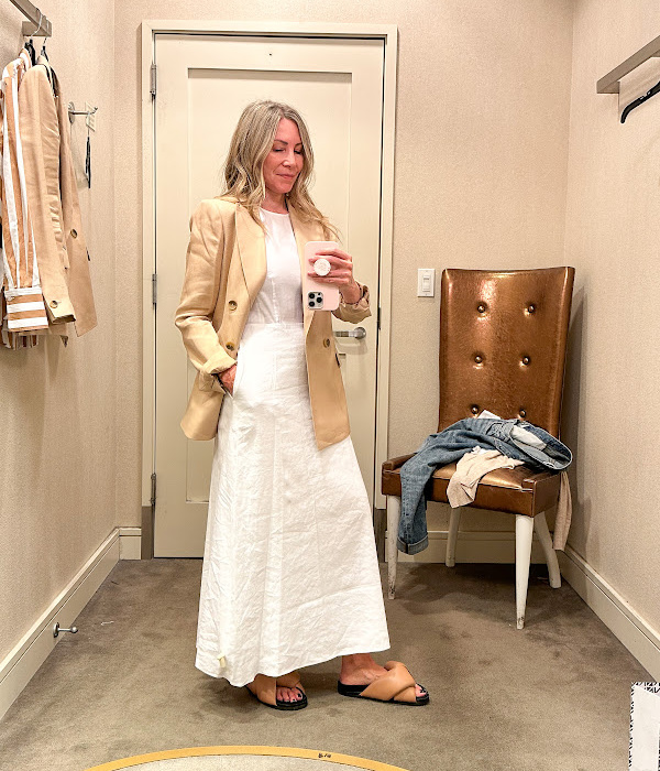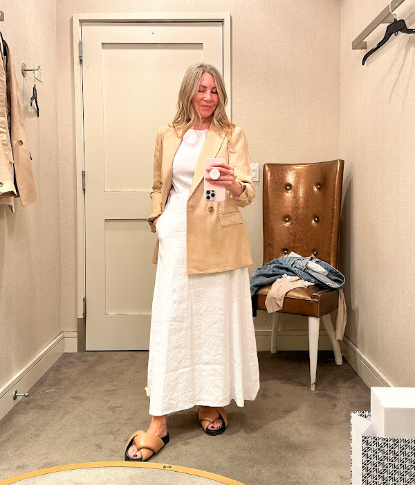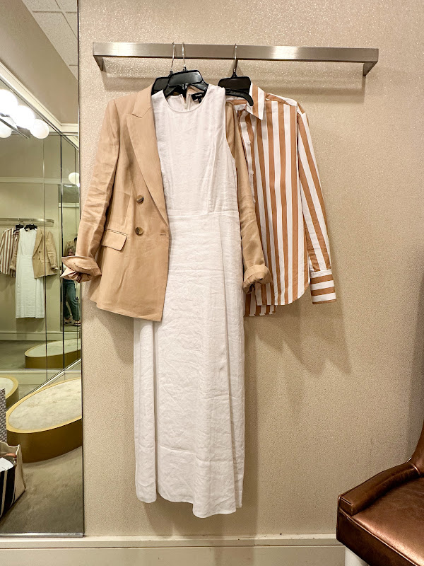 When I saw this linen blend dress my heart skipped a beat. I tried it on and it was like Cinderella’s glass slipper. Yes, it needs to be ironed. The tan jacket is the perfect topper to ward off an evening chill.