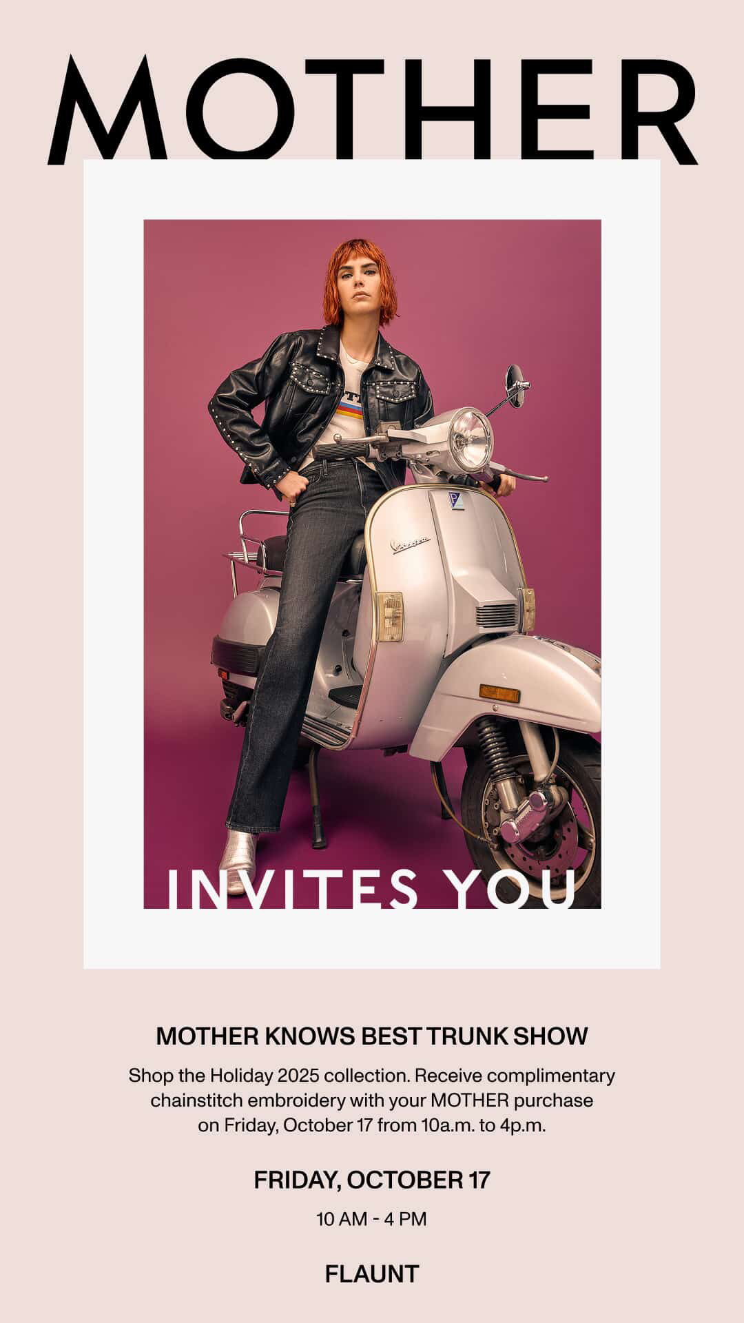 - Flaunt’s Mother Denim 2025 Holiday Collection debut event is coming up next week … Friday, October 17, 10-4.